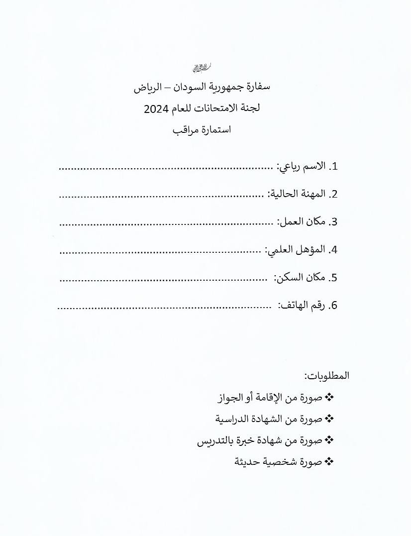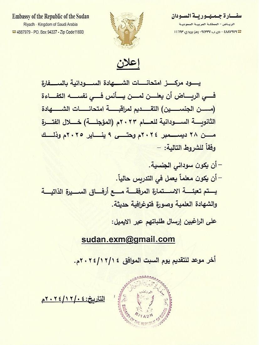 متابعات- الزاوية نت- أعنت مركز امتحانات الشهادة السودانية في سفارة السودان بالرياض، أن يعلن لمن يأنس في نفسه الكفاءة من الجنسين، التقديم لمراقبة امتحانات الشهادة الثانوية السودانية للعام 2023م المؤجلة خلال الفترة من 28 ديسمبر 2024م وحتى 9 يناير 2025م وذلك