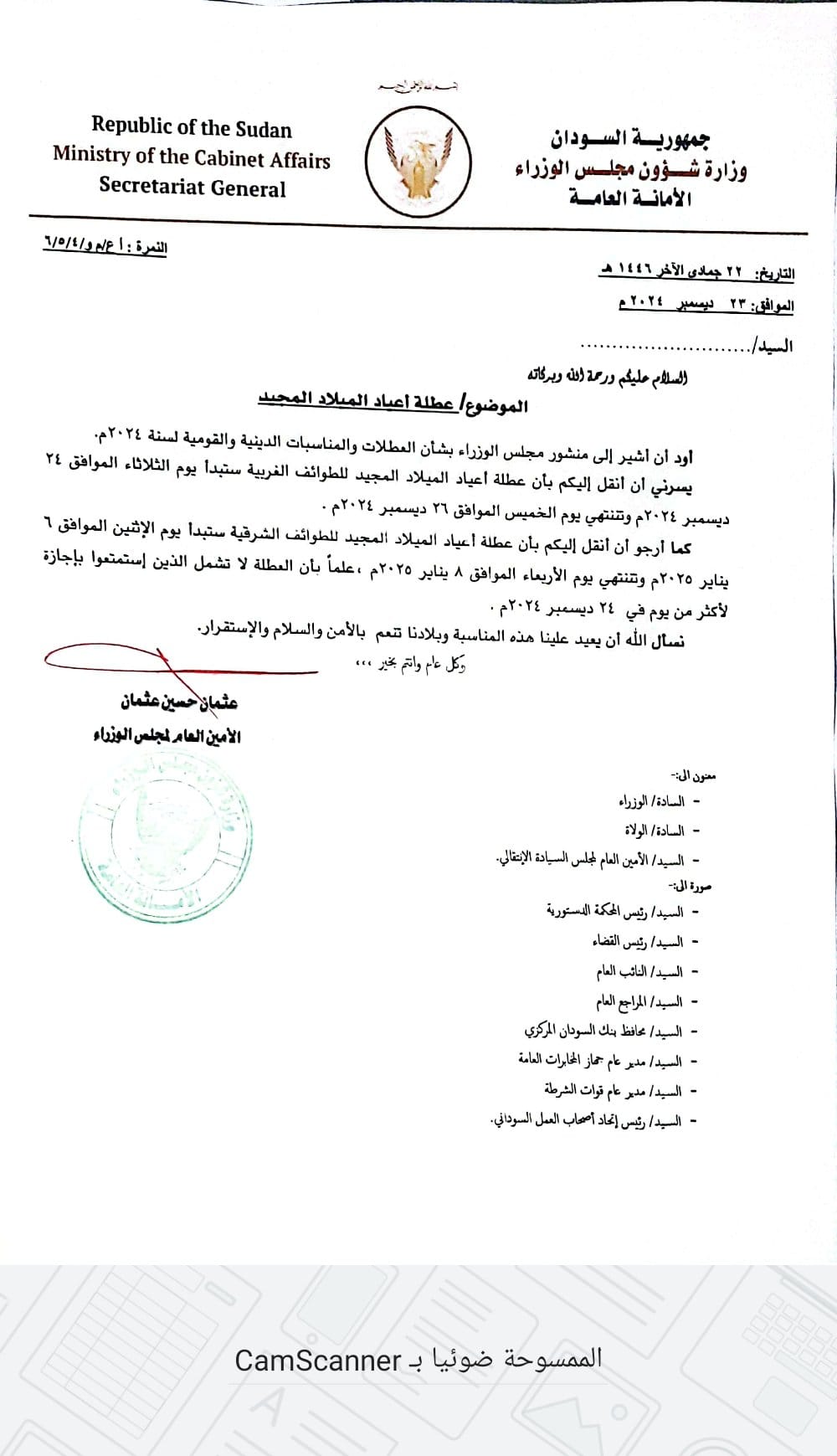 متابعات- الزاوية نت- أعلن مجلس الوزراء السوداني، أن عطلة أعياد الميلاد المجيد للطوائف الغربية تبدأ اليوم الثلاثاء الموافق 24 ديسمبر 2024م، وتنتهي في 26 ديسمبر 2024م.