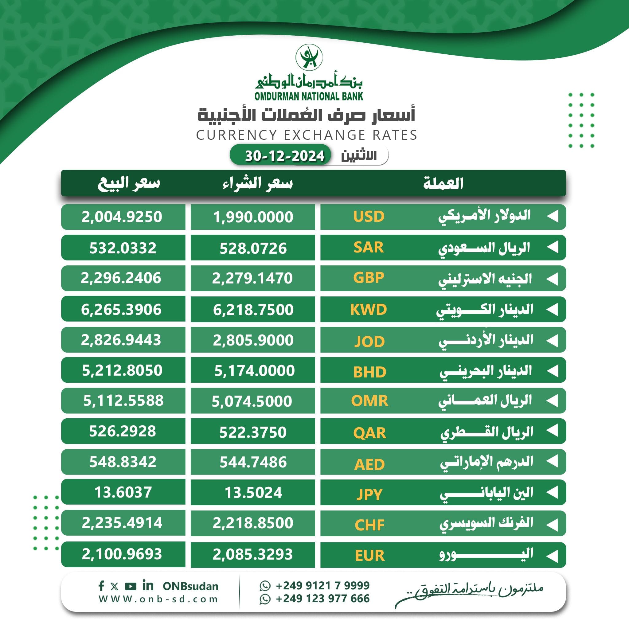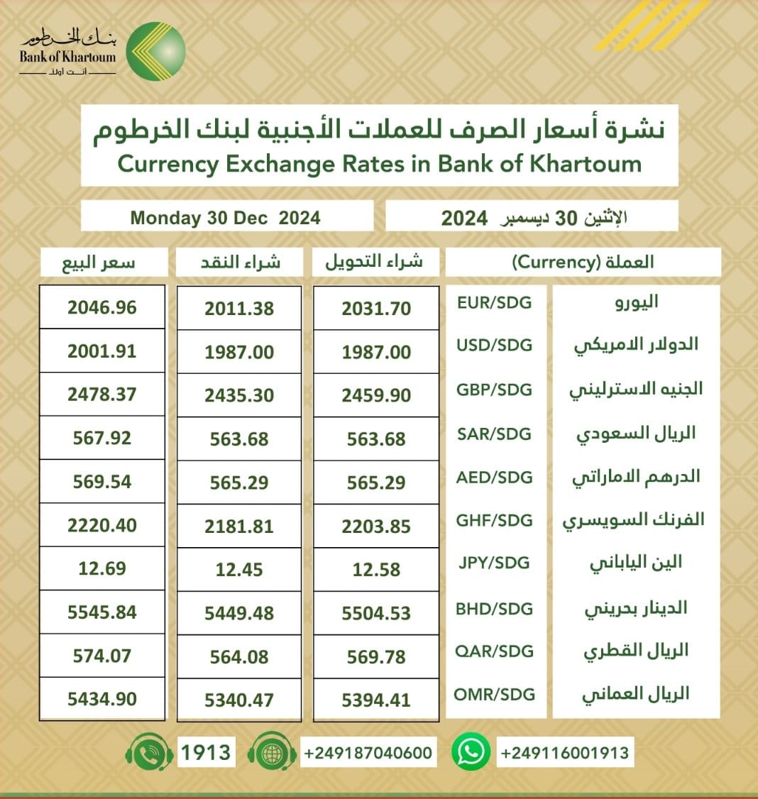 اقتصادالرئيسية تعرف على الفرق في أسعار العملات بين بنك الخرطوم وبنك أمدرمان الوطني بواسطة الزاوية آخر تحديث ديسمبر 30, 2024 0 شارك متابعات- الزاوية نت- ينشر (الزاوية نت) قائمة تداولات أسعار العملات في بنك الخرطوم وبنك أمدرمان الوطني حسب ما تم تداوله اليوم 30 ديسمبر 2024م كم سعر الدولار في البنوك السودانية؟.. تابع الجداول اناه أسعار العملات في بنك أمدرمان بنك_أم درمان_الوطنيبنك_الخرطوم 0 شارك