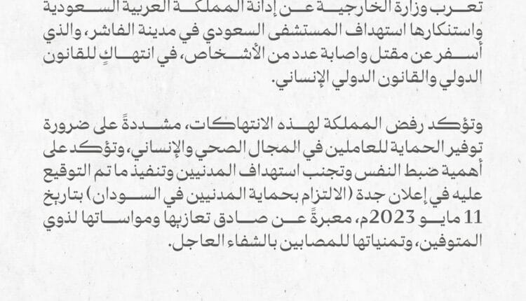 متابعات- الزاوية نت- أعربت وزارة الخارجية السعودية، عن إدانتها واستنكارها استهداف المستشفى السعودي في مدينة الفاشر، والذي أسفر عن مقتل واصابة عدد من الأشخاص، في انتهاك للقانون الدولي والقانون الدولي الإنساني.