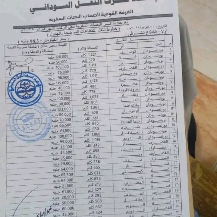 وحددت التعرفة تذكرة بورتسودان- كوستي 120 جنيه، بورتسودان كسلا 56 جنيه وبورتسودان سنار 105جنيه.