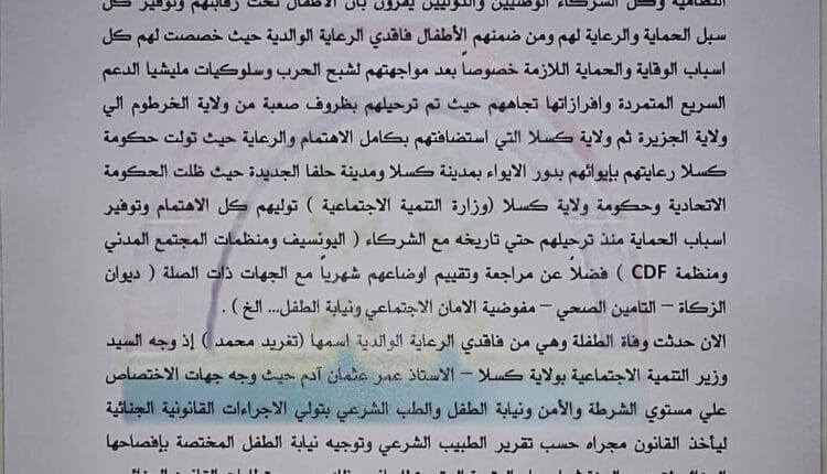 متابعات- الزاوية نت- وجه وزير التنمية الاجتماعية بولاية كسلا عمر عثمان آدم، جهات الاختصاص على مستوى الشرطة والأمن ونيابة الطفل والطب الشرعي بتولي الاجراءات القانونية الجنائية في التحقيق على وفاة طفلة من فاقدي الرعاية الوالدية اسمها تغريد محمد.