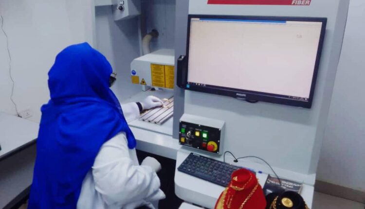 وقال د. أحمد إن قسم دمغ المصوغات يقوم بالدور الرقابي على المعادن النفيسة وفقاً لقانون المعادن النفيسة والأحجار الكريمة لتحديد العيارات للمعادن النفيسة من ذھب وفضة والختم للإنتاج المحلي من سبائك ومشغولات وأن عملية التحليل تتم عبر جھاز (XRF) الأشعة السينية والطريقة الكيميائية وأن الختم يتم بجھاز الليزر والختم اليدوي.