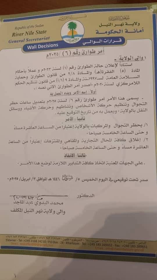 متابعات- الزاوية نت- أصدر محمد البدوي عبد الماجد والي ولاية نهر النيل المكلف، قرارًا بحظر التجوال والمركبات بالولاية اعتبارا من الساعة العاشرة مساءً و حتى الساعة الخامسة صباحا.