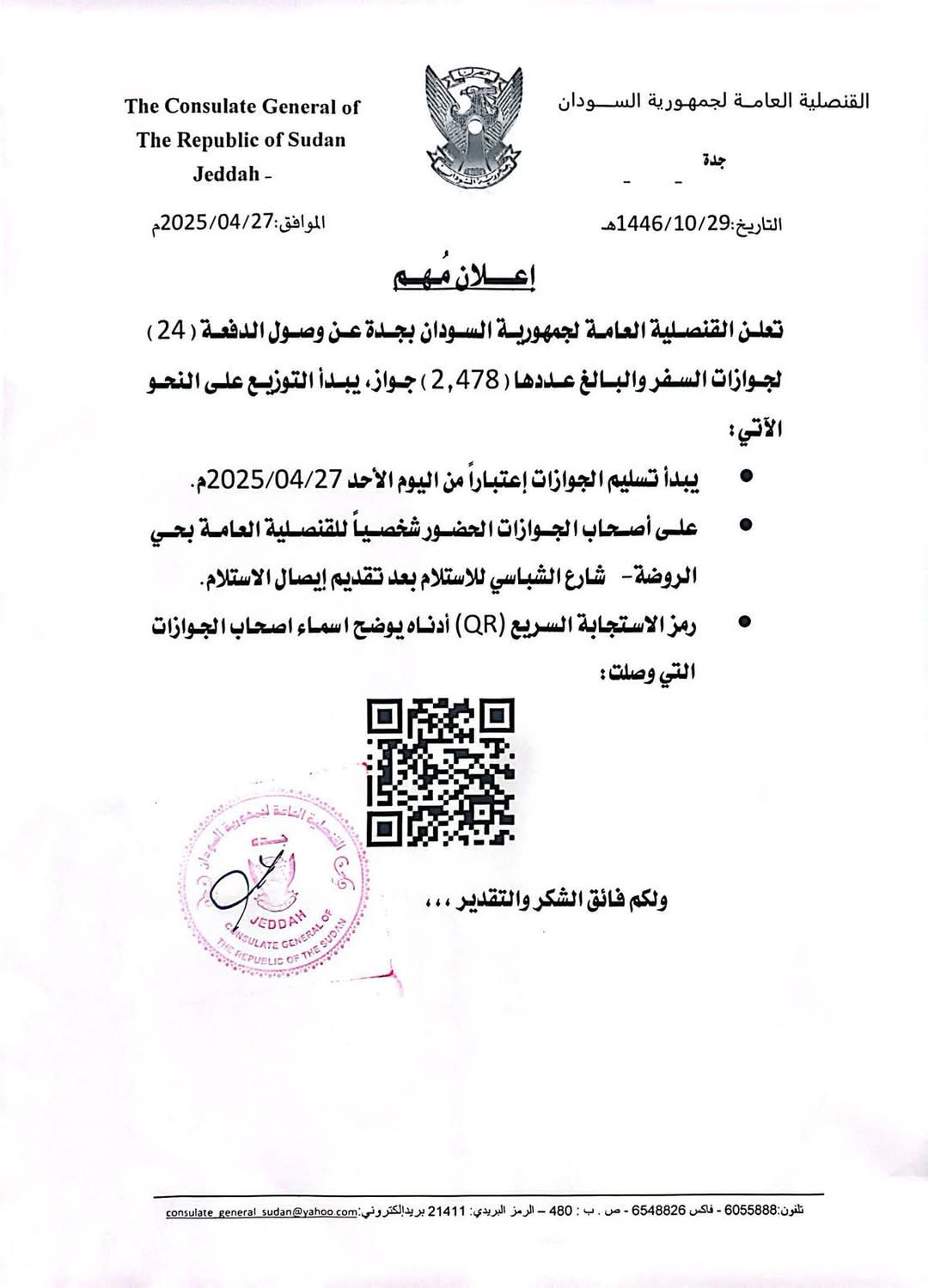 ودعت أصحاب الجوازات الحضور شخصياً للقنصلية العامة بحي الروضة – شارع الشباسي للاستلام بعد تقديم إيصال الاستلام.