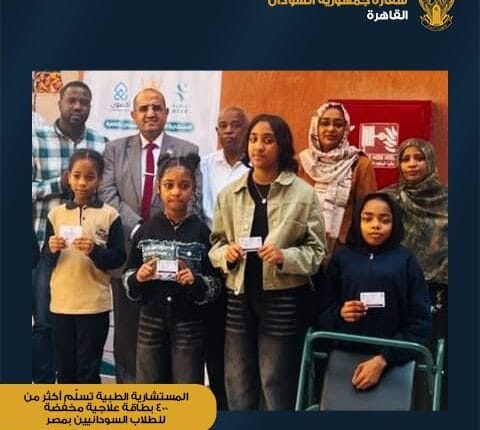 متابعات- الزاوية نت- أعلنت المستشارية الطبية، في سفارة السودان في القاهرة، عن تسليم أكثر من 400 بطاقة علاجية مخفضة للطلاب السودانيين، خلال فعالية أقيمت بإحدى المدارس بمحافظة القاهرة.